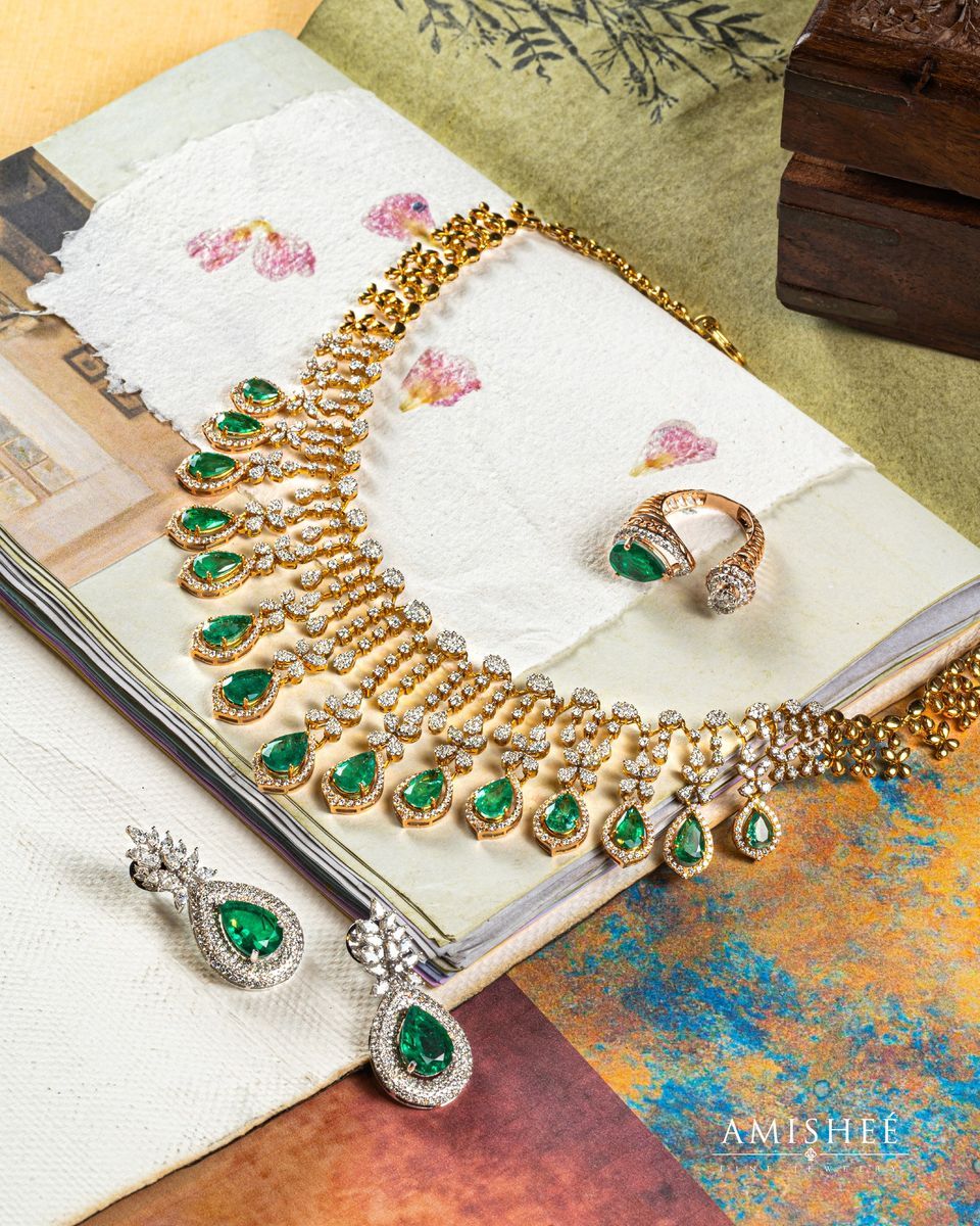 The effervescence of glowing emeralds meets the sparkle of diamonds to create a beautiful symphony that is this necklace. The rows of diamond studded floral vines demand attention as they come alive with each movement while the deep green droplets at the bottom capture the imagination and hold it still.